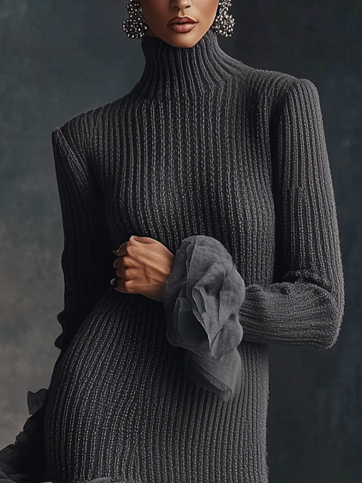 Elegant Casual And Comfortable Long-sleeved Cream Knitted Satin Pleated Hem Maxi Dress$35.32 USD$158.98 USD