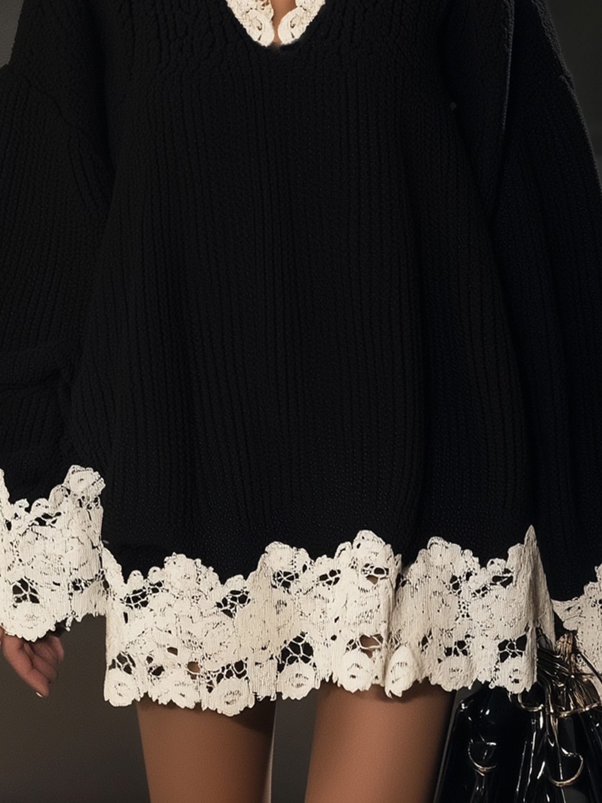 This black knit dress is a staple piece, perfectly accented by delicate white lace trim. The relaxed fit offers an effortlessly chic vibe that can be dressed up or down, suitable for a variety of occasions.