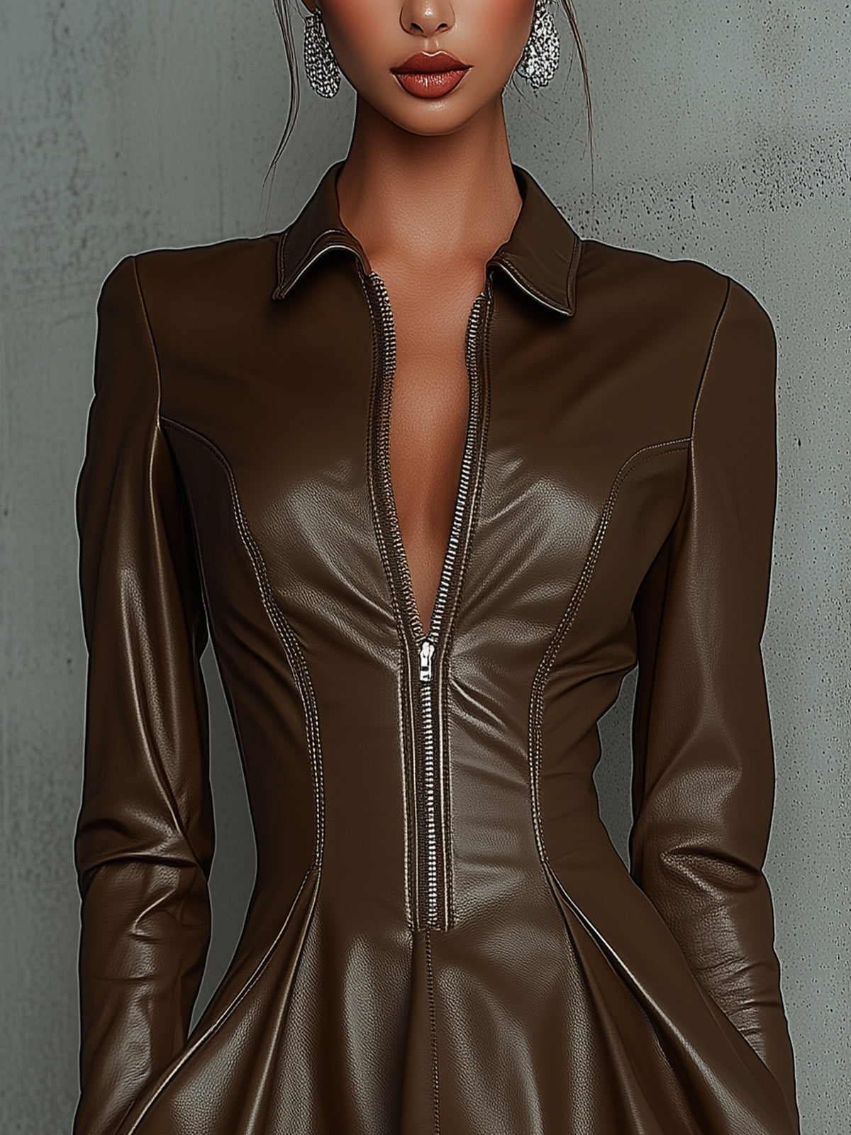 The dress presents a bold fashion statement, blending structure with a feminine flare. The zipper adds an adjustable element while the fit ensures a flattering shape.