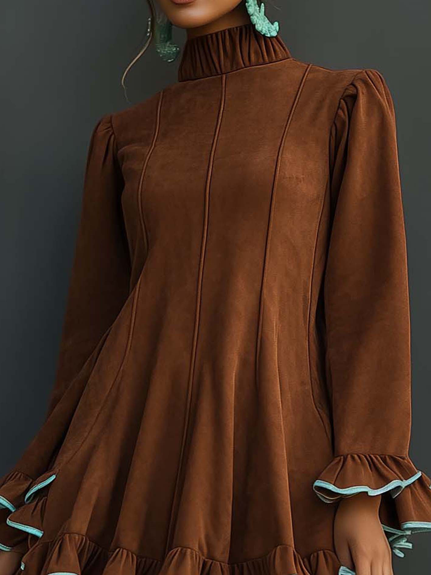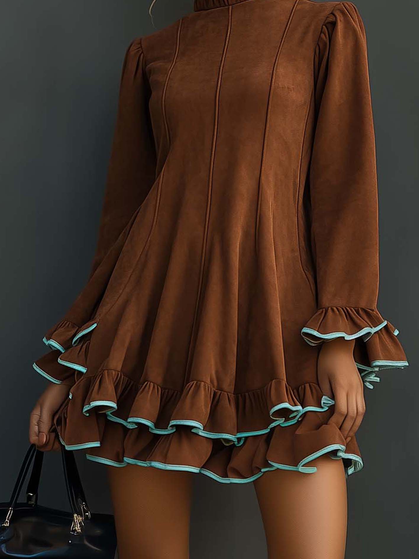 This brown faux suede mini dress stands out for its tactile richness and refined contrast detailing. The mint green hem adds a soft, unexpected freshness to the earthy base, balancing warmth and modernity. It embodies quiet sophistication with a touch of playful design.