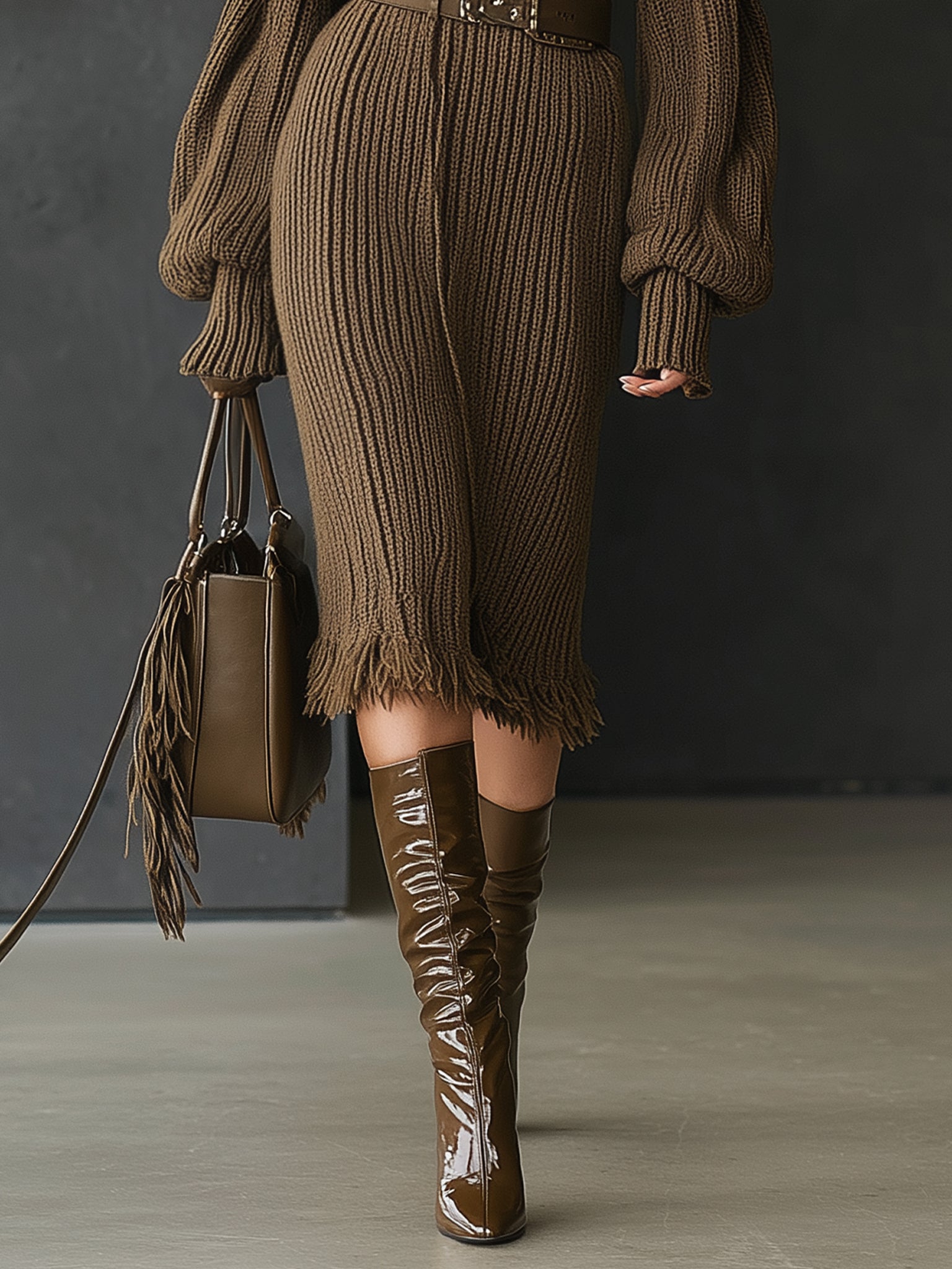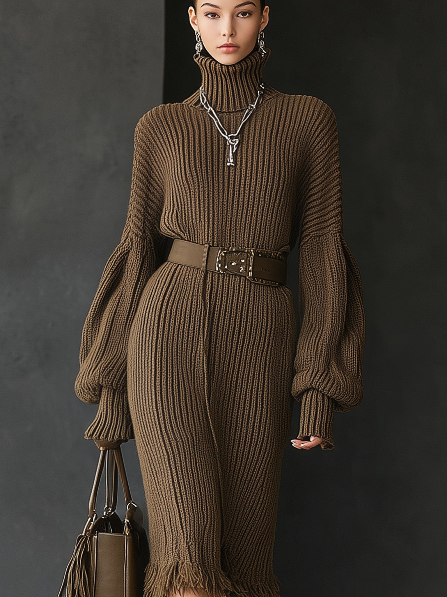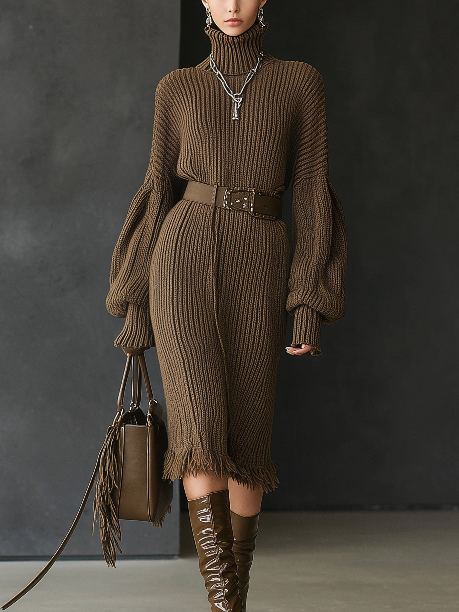 This chocolate brown turtleneck knit dress is an exquisite harmony of comfort and sophistication. The chunky ribbed texture lays the foundation for a fashion-forward look, while exaggerated balloon sleeves and fringed hem details add modern flair. A wide waist belt breaks up the silhouette with bold structure, enhancing the natural waist. Styled with knee-high boots and a matching leather fringe handbag, this ensemble exudes urban elegance with a hint of retro chic. Ideal for fall and winter styling, this dress makes a confident statement while keeping you cozy and poised. Complete the look with silver jewelry to enhance its contemporary sophistication.