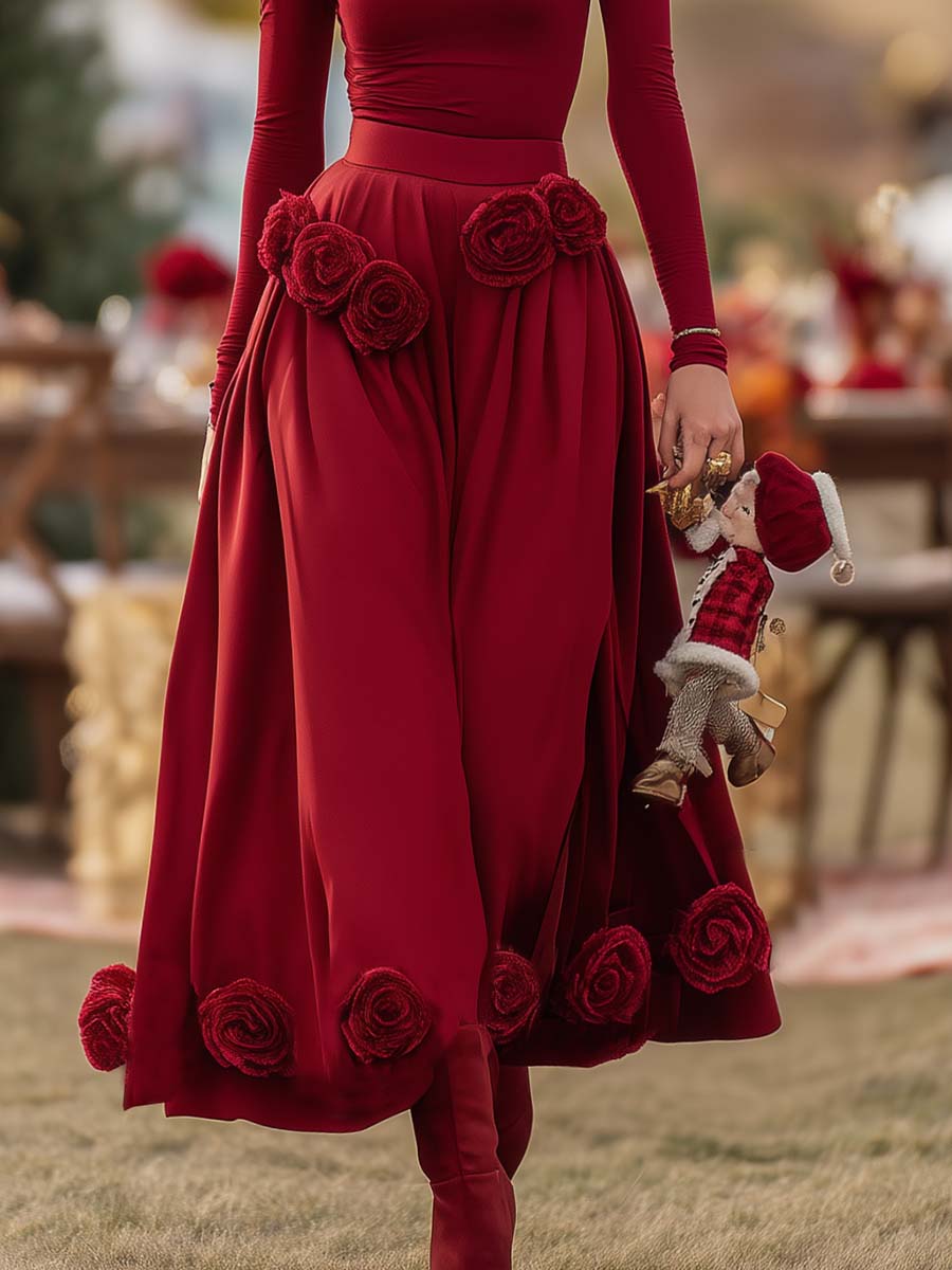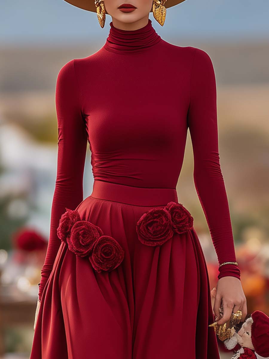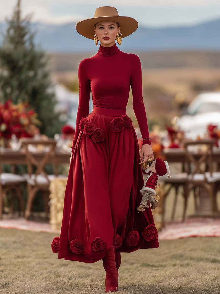 This elegant Christmas Limited Edition set includes a charming red turtleneck top paired with a 3D floral decorated long skirt. Crafted to encapsulate the festive spirit, this ensemble perfectly blends sophistication with a festive flair.