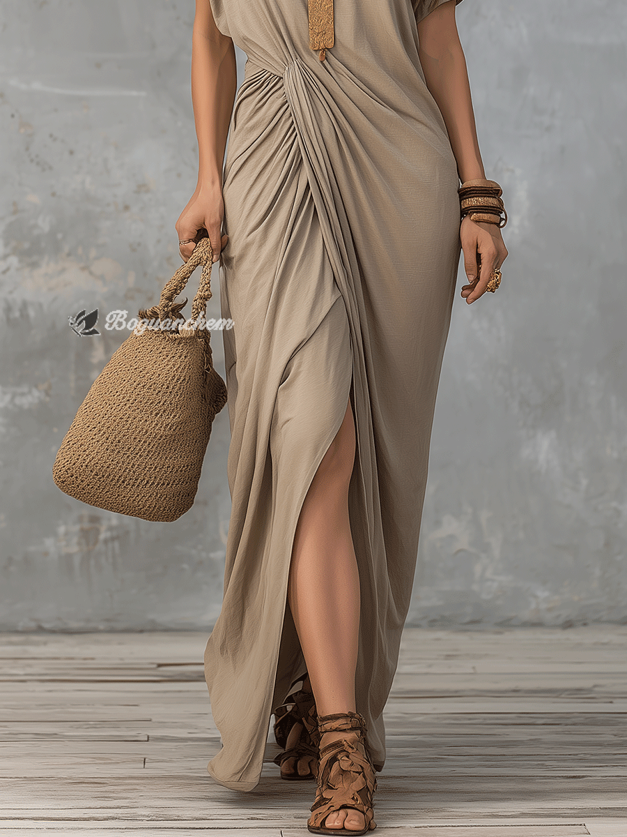 Draped Taupe Boho Maxi Dress With Side Twist Detail