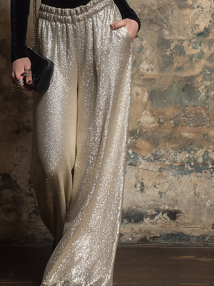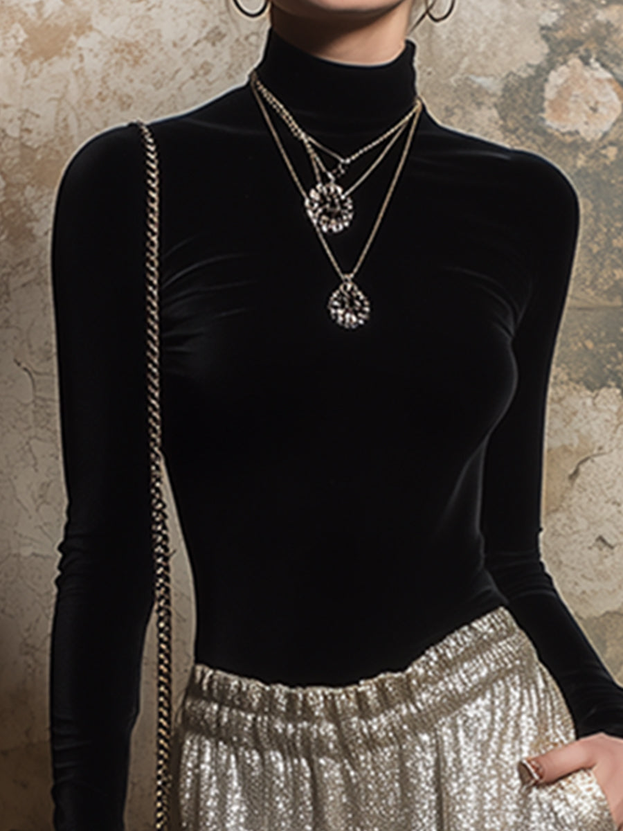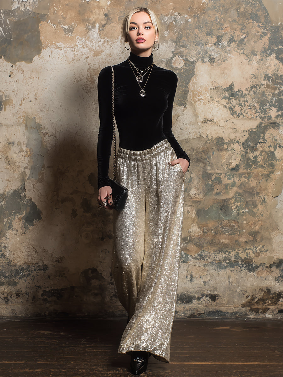 Pair it with heels or elegant flats to accentuate your refined taste. Delicate gold jewelry complements the light gold wide-leg trousers perfectly. A small clutch adds a touch of elegance. This elegant black velvet top and light gold wide-leg trouser suit is ideal for those who seek a unique style. The perfect blend of luxurious fabrics and modern design ensures you stand out confidently and gracefully in any setting.
