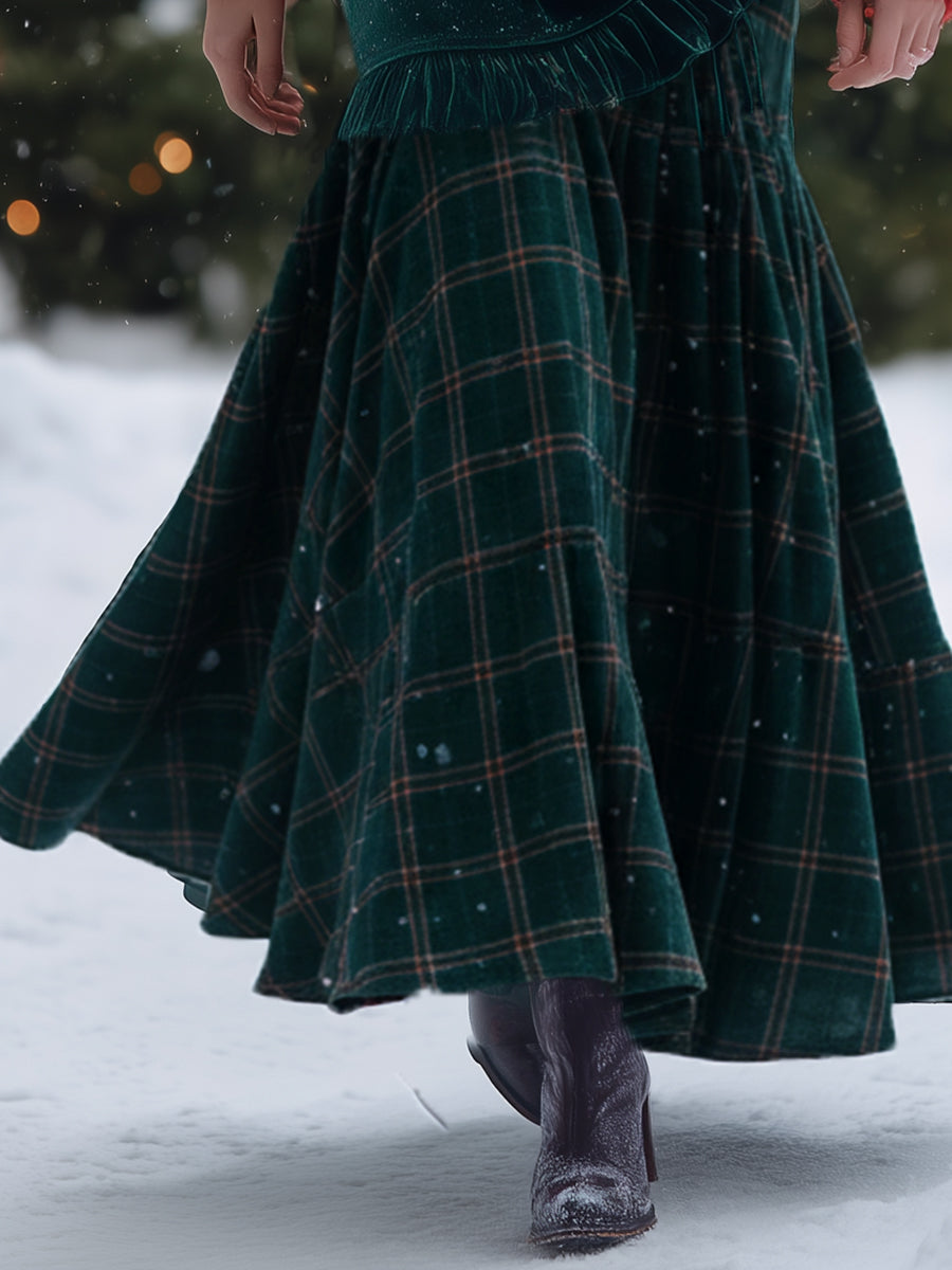 The Fashionable Tight Fishtail Plaid Print Christmas Green Velvet Skirt is a captivating blend of festive charm and figure-flattering elegance. Crafted from luxurious green velvet with a subtle shine, this skirt features a classic plaid print delicately woven into the fabric—offering a seasonal twist on a timeless pattern. The body-hugging fit sculpts the waist and hips, elegantly flaring out at the hem in a fishtail or mermaid silhouette that adds drama and sophistication with every step.