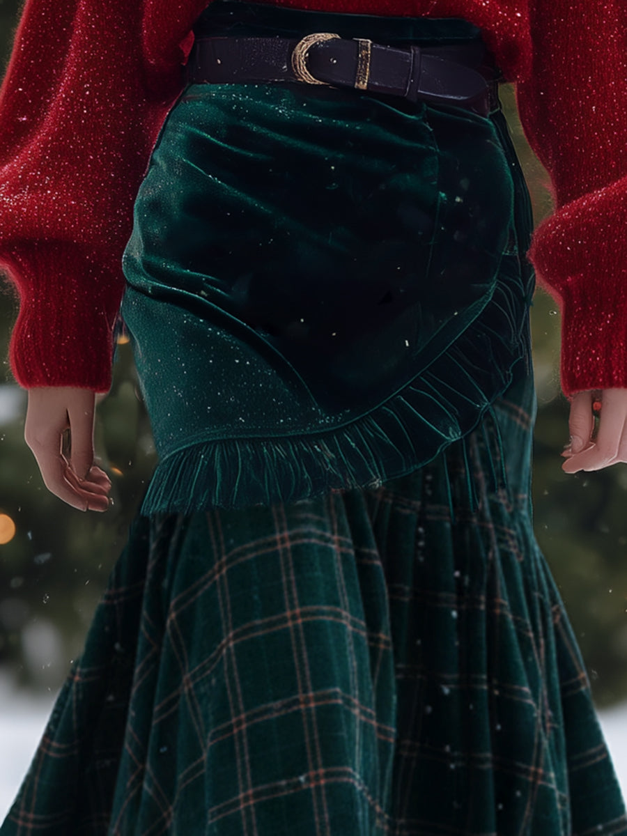 Perfect for holiday parties, winter gatherings, or a chic seasonal date night, this velvet skirt effortlessly combines coziness with high style. The rich green shade nods to classic Christmas palettes, while the tailored silhouette ensures a polished, fashion-forward statement. Pair it with a tucked-in blouse, a soft knit sweater, or a faux fur coat, and complete the look with heels or suede boots. The Fashionable Tight Fishtail Plaid Print Christmas Green Velvet Skirt is a standout piece that brings festive glamour and timeless allure to your holiday wardrobe.