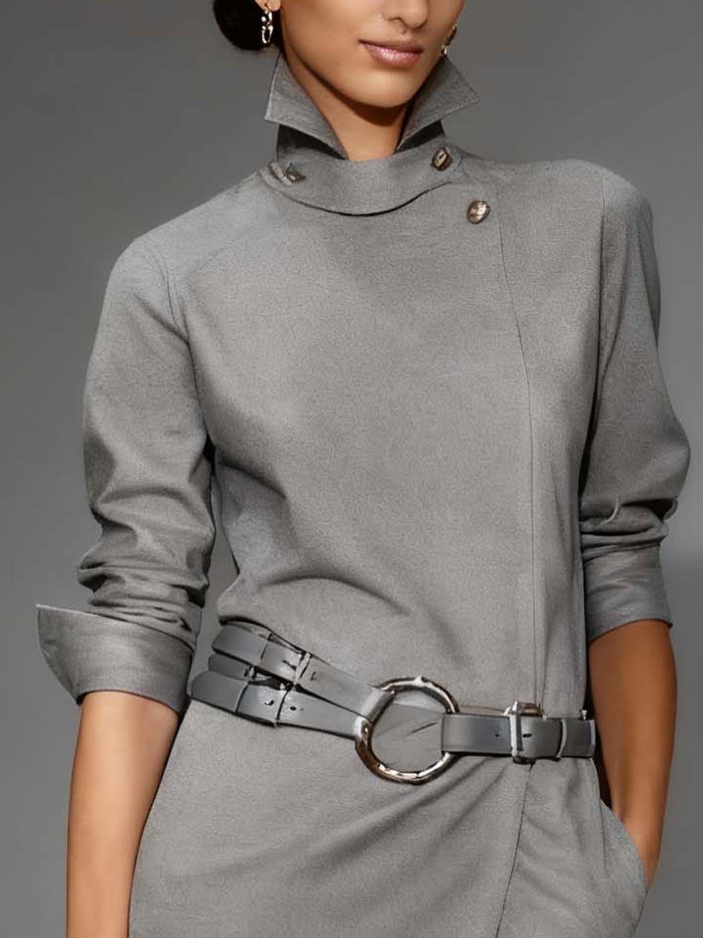 - Design: Features a high collar with button accents, three-quarter sleeves, and a wrap-style front enhanced by a wide belt with a metallic buckle.