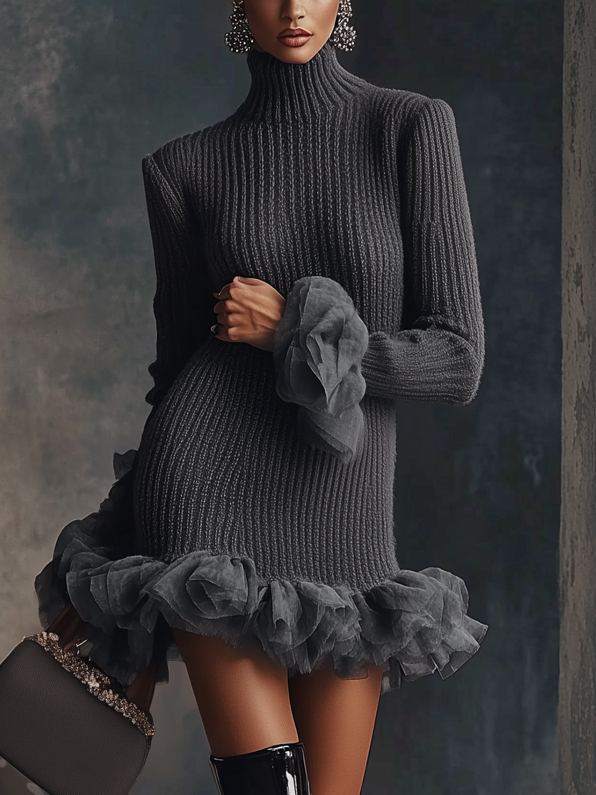 This sweater dress combines classic knit comfort with avant-garde elegance. The structured turtleneck balances the whimsical tulle details, creating an eye-catching silhouette.