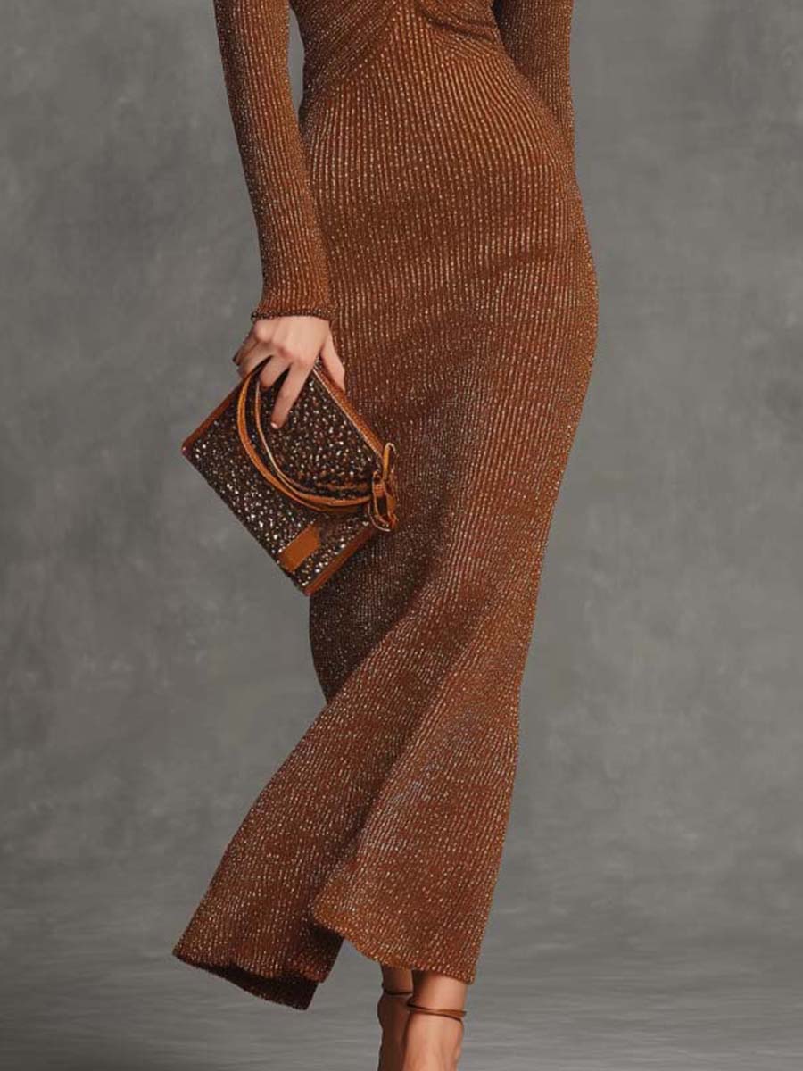 The vertical rib texture visually slims the figure, and the warm bronze tone reflects 2026 Spring/Summer color trends, where soft metallics, burnished copper, and warm earth-inspired neutrals continue to define elevated evening and occasion wear.