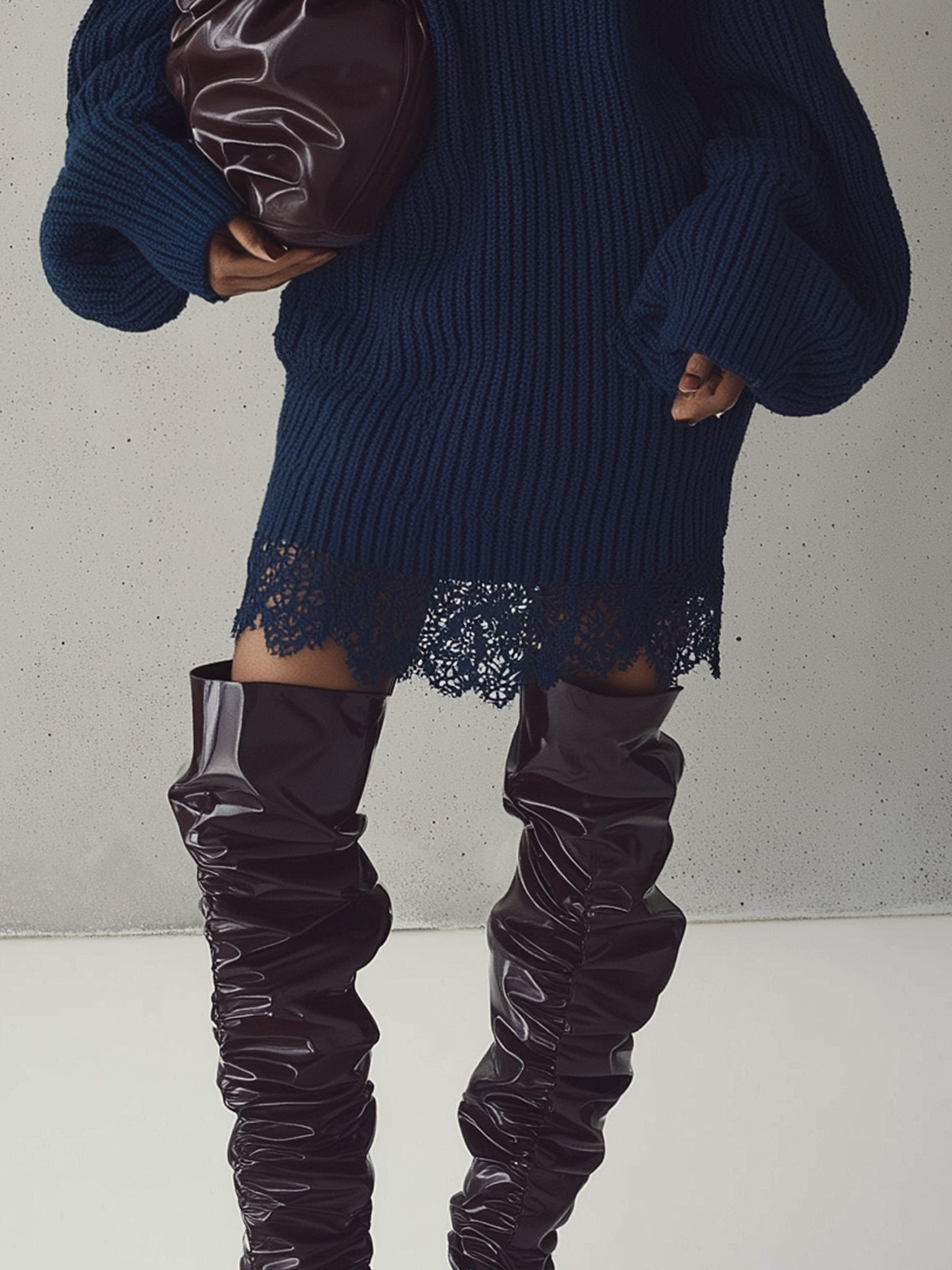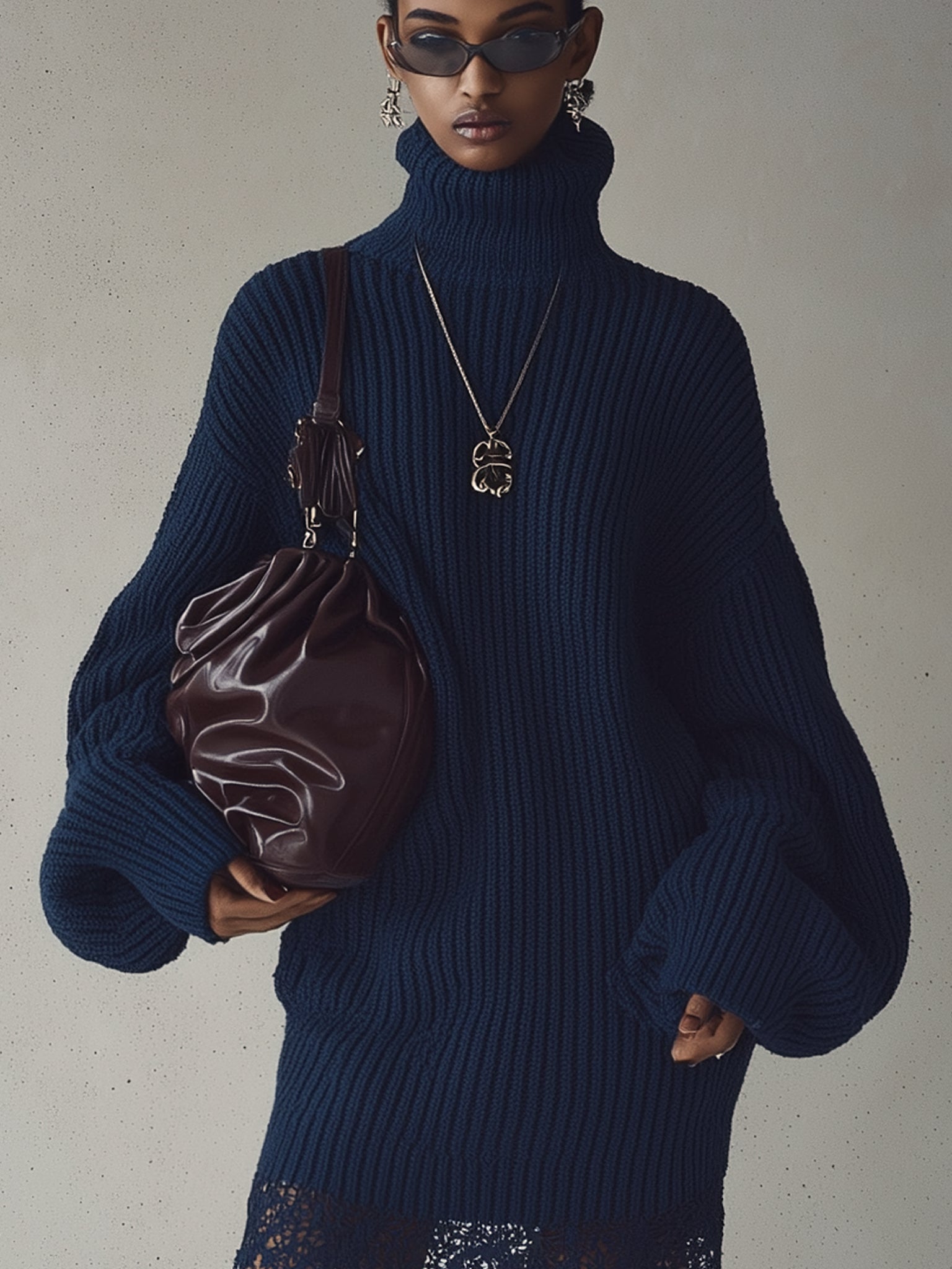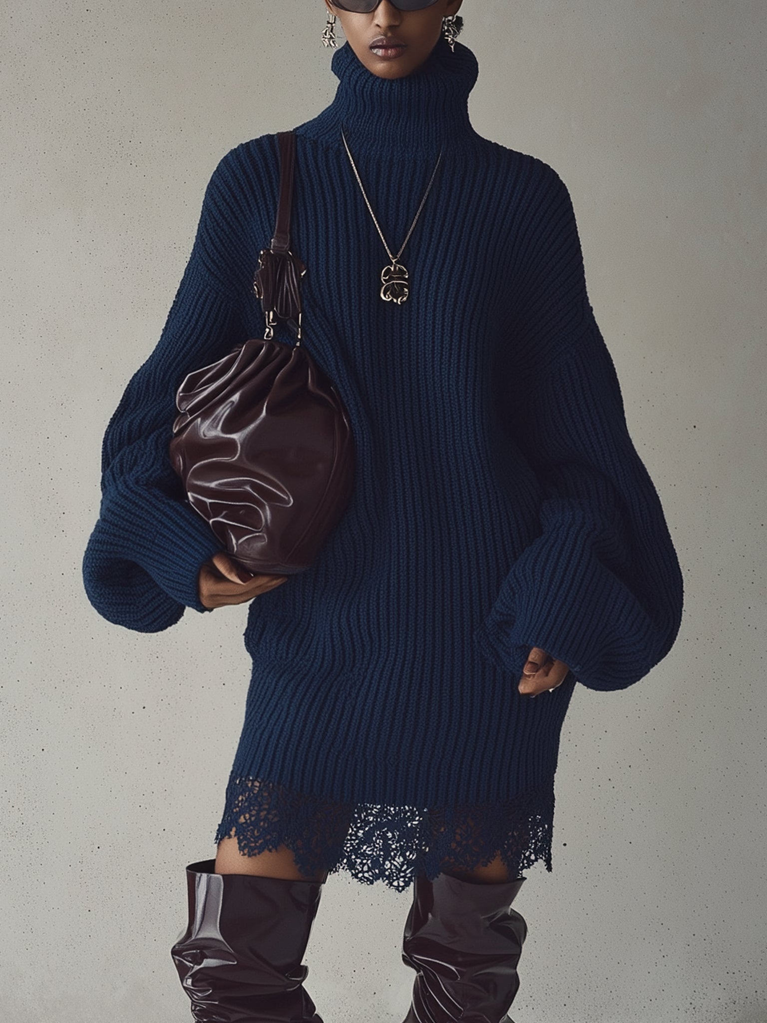 This navy knit mini dress is a masterclass in textural contrast and urban sophistication. The thick ribbed turtleneck silhouette exudes effortless cool, while the peekaboo lace detailing invites a touch of modern romance. Designed for the contemporary woman who craves both comfort and bold presence, it's best styled with knee-high boots, oversized shades, and a sculptural bag for a fashion-forward cold weather look. Whether you're sipping coffee in the city or heading to an evening art event, this dress strikes the perfect balance between cozy and couture.