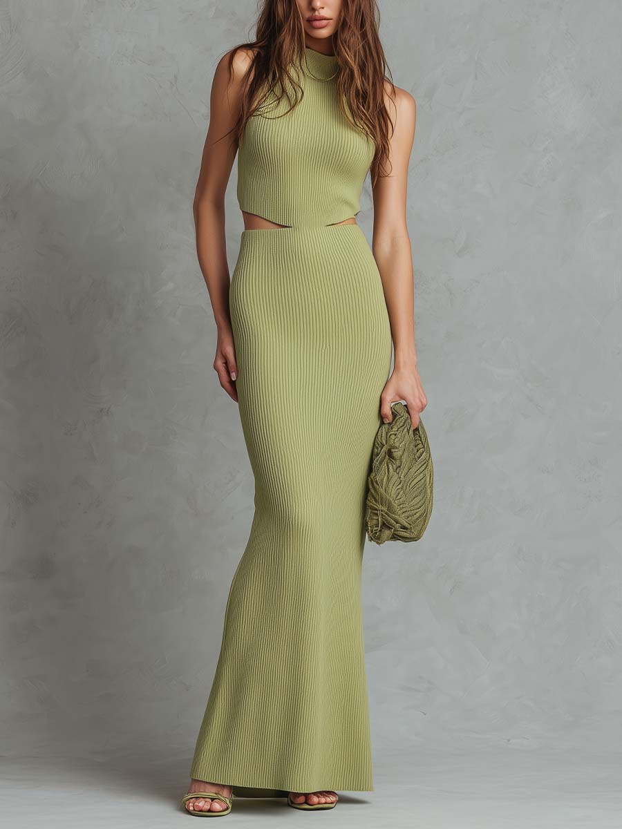 This modern maxi dress is crafted from a finely ribbed knit, designed to contour the body with a clean, elongated silhouette. The sleeveless high-neck bodice flows seamlessly into a fitted skirt, while subtle waist cut-outs add a refined sense of structure and visual interest without feeling revealing.