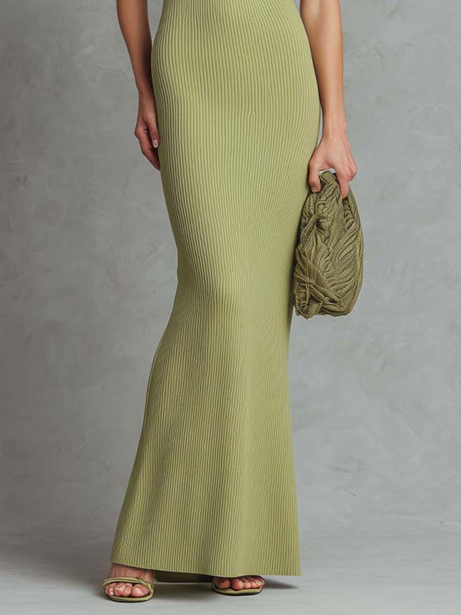 The vertical rib texture enhances length and shape, creating a sleek, sculpted look that remains comfortable and easy to wear. The soft muted green tone reflects 2026 Spring/Summer color trends, where natural greens, sage, and fresh botanical hues continue to dominate minimalist and quiet-luxury womenswear.