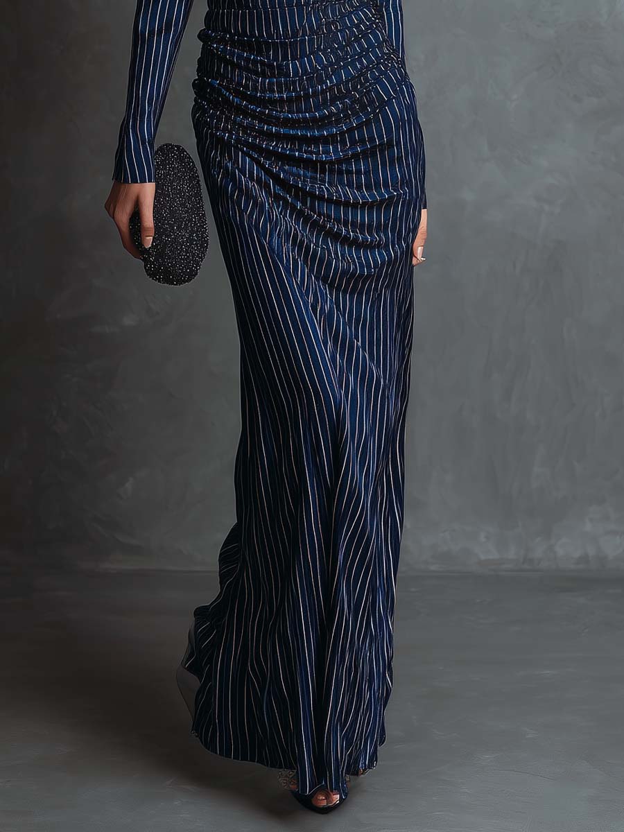 This maxi dress is crafted from matte satin with a smooth, refined surface and soft drape. The structured square neckline frames the collarbone beautifully, while the vertical pinstripe pattern elongates the silhouette for a sleek, elegant look. Subtle ruching through the waist and hips enhances natural curves without feeling restrictive, flowing into a full-length hem that moves effortlessly. Designed to feel polished yet wearable, this dress is ideal for evening occasions and elevated gatherings.