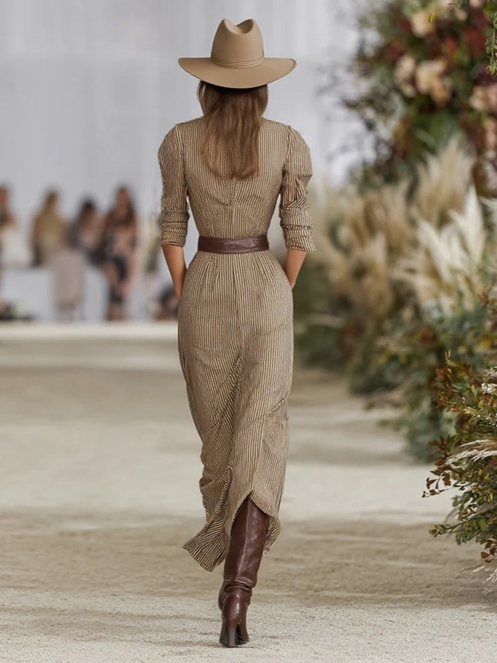 A stylish striped maxi dress featuring a lapel collar and single-breasted front, designed for a relaxed yet refined silhouette. The waistline is shaped without a belt for effortless, understated elegance.